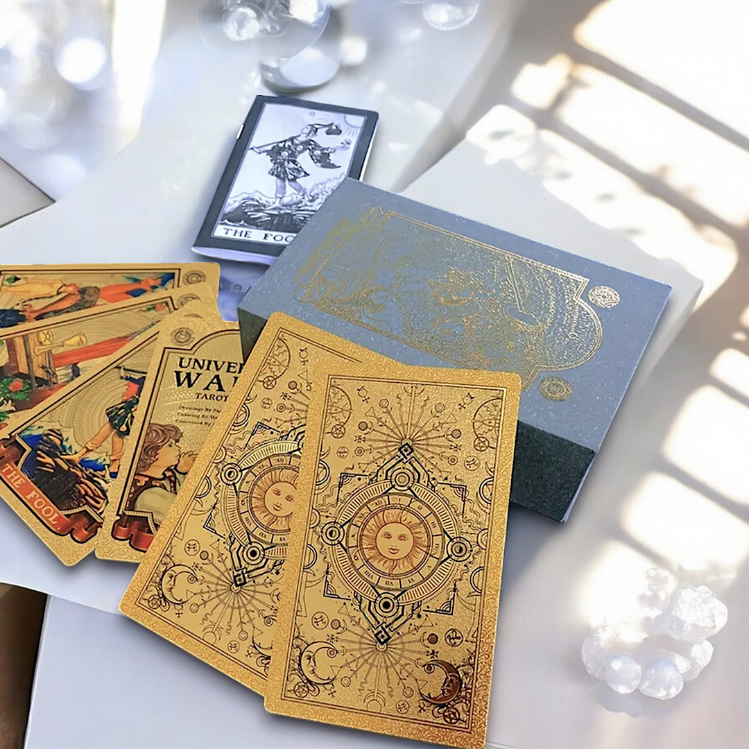 NOCTURNAL DELUXE TAROT er et eksklusivt tarotsæt for dig, der tiltrækkes af det mystiske og dragende. Den sorte og grå æske med flot multifarvet tryk rummer 78 luksuriøse kort i glitrende guldmetal-look – en visuel og energetisk oplevelse, der både æstetisk og intuitivt kalder på fordybelse. Denne udgave er en hyldest til den klassiske “The Fool”-rejse – det evige spring ud i det ukendte med tillid til, at meningen viser sig undervejs.