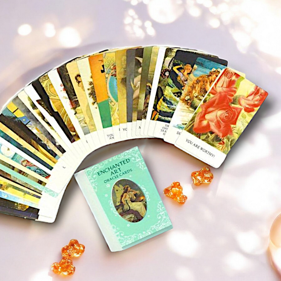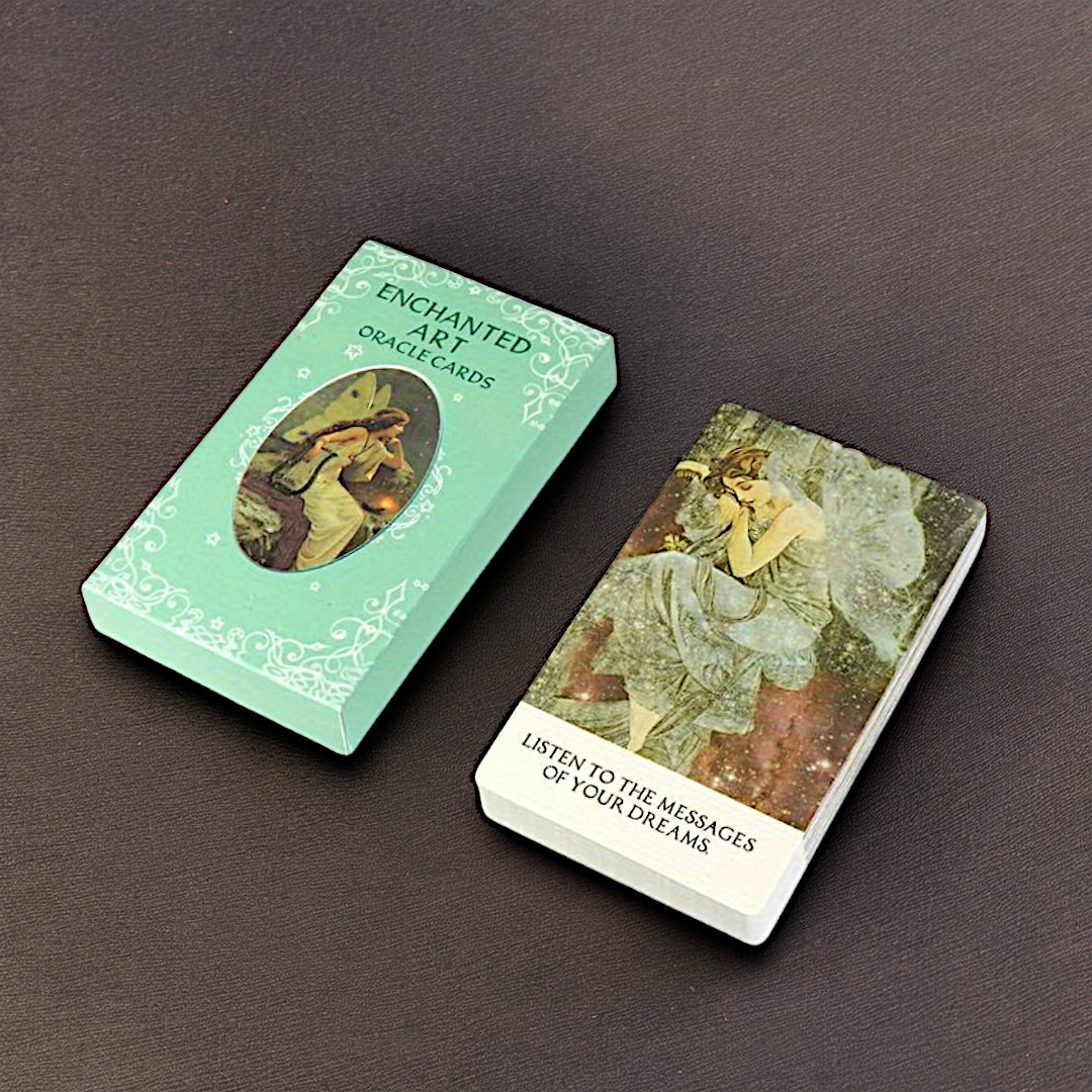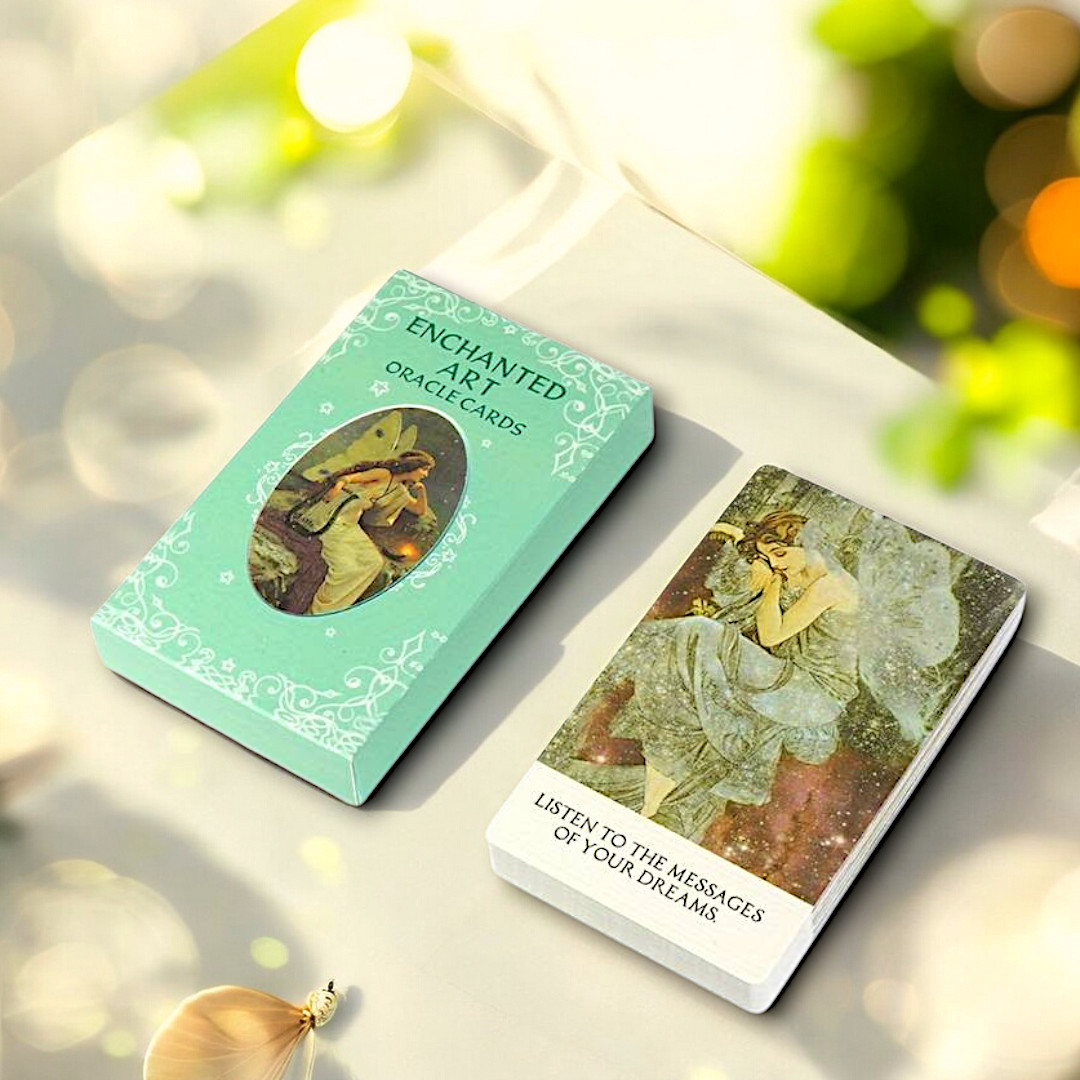 ENCHANTED ART er et poetisk og intuitivt orakelkortsæt, der kombinerer fortryllende vintagekunst med enkle, men dybe budskaber. Hvert kort rummer en besked til hjertet – som en viskning fra din indre visdom. Med udgangspunkt i drømmende billedkunst og bløde farver, vækker kortene ikke blot intuitionen, men inviterer dig til at forbinde dig med det, der er større end dig selv – det sjælelige, det skabende, det nærværende.