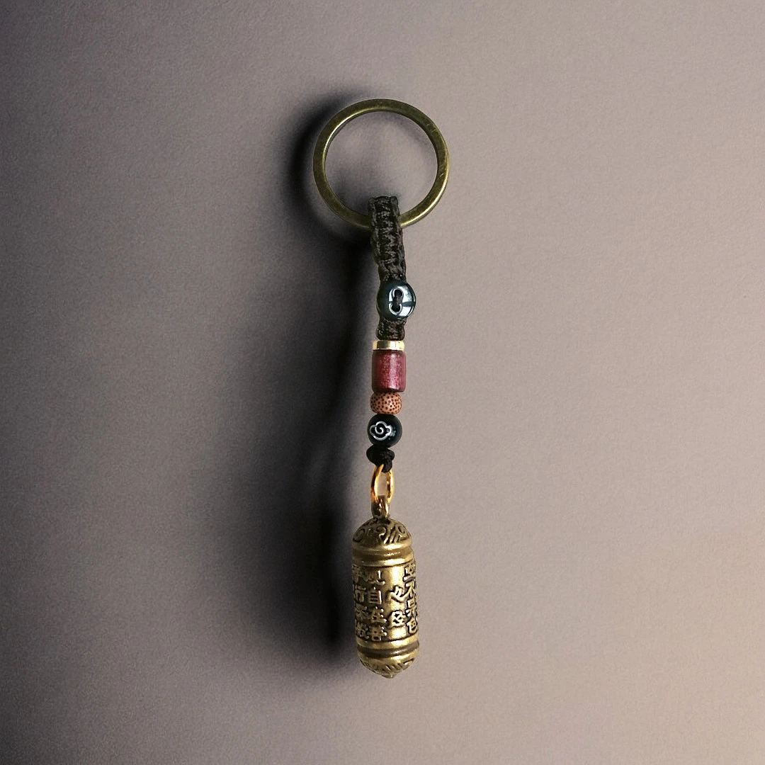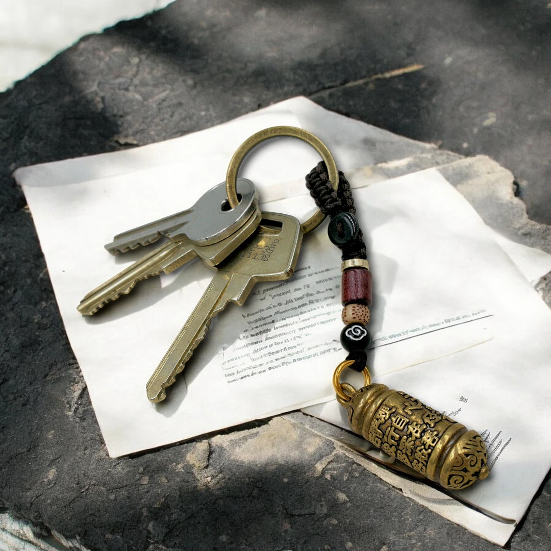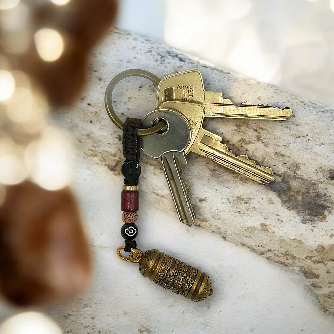 Dette nøglevedhæng forener minimalisme med spirituel betydning på en smuk og enkel måde. Med sin stilrene cylinder, dekoreret med ældgamle skrifttegn, fungerer det som en diskret opbevaringsplads til dit personlige mantra, en affirmation eller en lille besked, der giver mening for dig.
