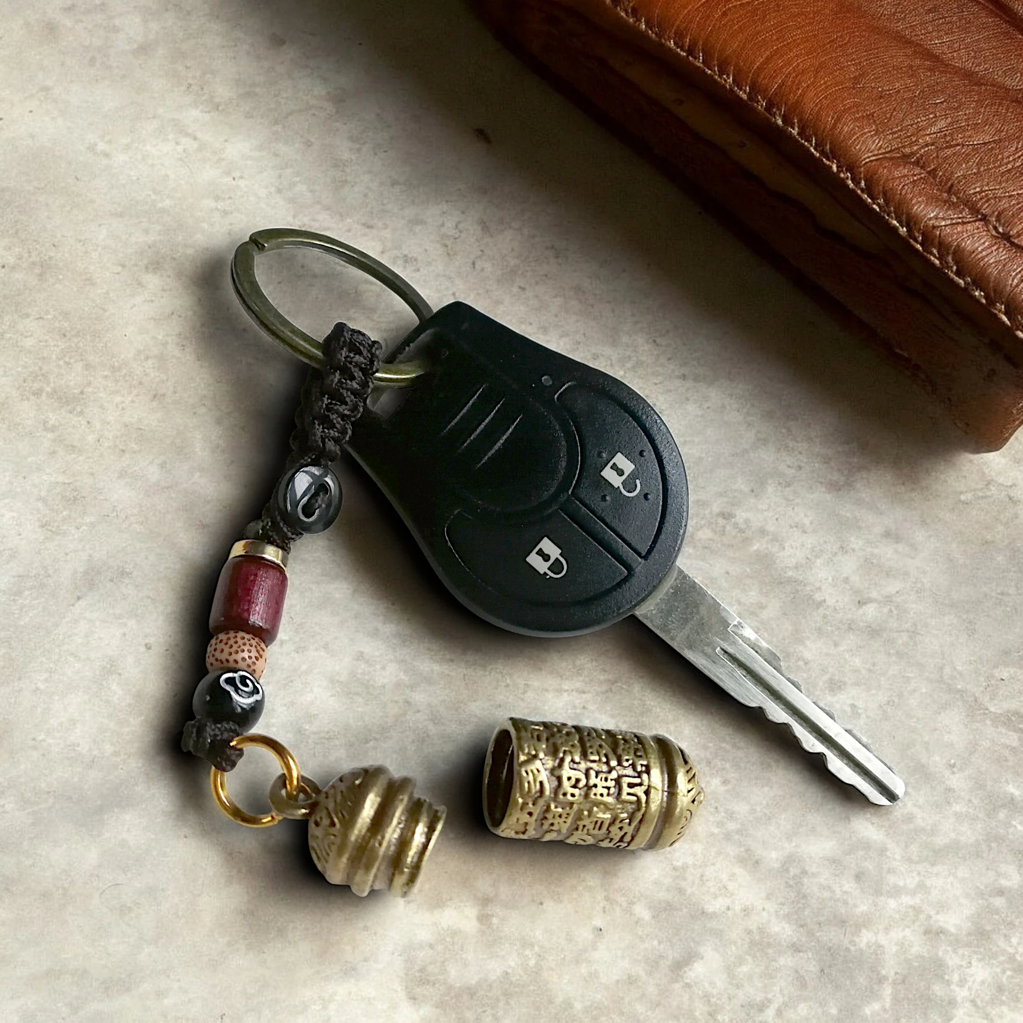 Vedhænget har en stilren sammensætning af naturlige træperler og oxideret messing, der tilføjer et autentisk og spirituelt udtryk. Den kunstsilkeflettede strop sikrer holdbarhed og en behagelig tekstur, mens det kompakte design gør det let at bære i lommen, tasken eller som en simpel nøglering.